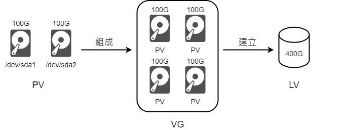 LVM會將多個PV結合成一個VG,其角色就像一個虛擬的大硬碟,多個PV的可用空間將會被融合再一起,每個VG最多僅能包含65534個PE。以LVM預設參數而言,預設為4M,故一個VG最大就是256G - LV (Logical Volume)