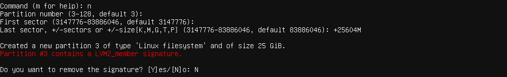 這裡一樣指定3號分區。起始磁區(First Sector)直接留空按Enter使用預設值,也就是可用磁區的最開始的地方。結束磁區(Last Sector)使用加號往後移動你調整的大小,這裡我的情況是+25604M。最後fdisk會發現這個分區上有舊有的LVM2的簽名,選擇N保留,不要移除。