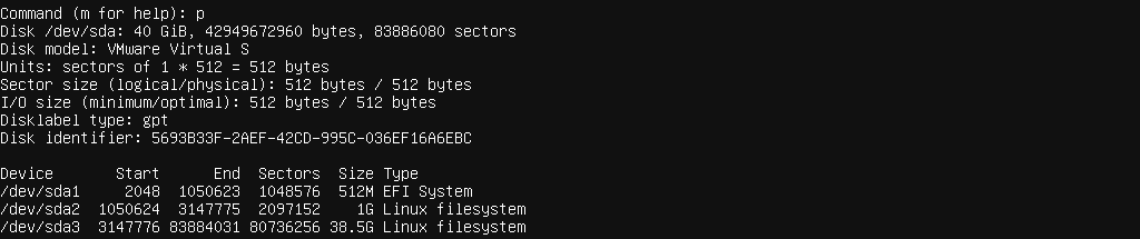 接著,先在Command輸入區的地方輸入p,可以看到目前的分區狀態,雖然PV縮小到了25G,但分區依然還有38.5G。