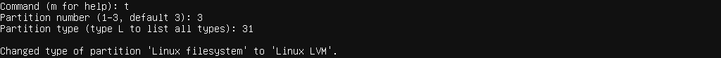 這裡一樣指定3號分區,並輸入31來將分區指定成Linux LVM類型