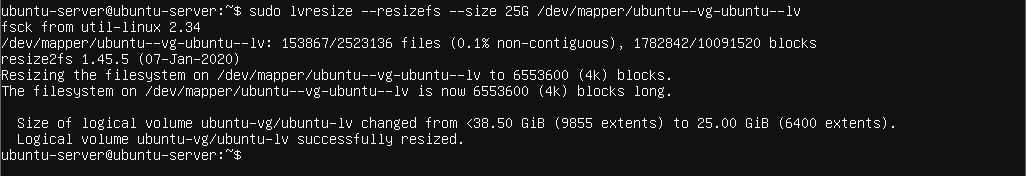 e.g sudo lvresize --resizefs --size 25G /dev/mapper/ubuntu--vg-ubuntu--lv